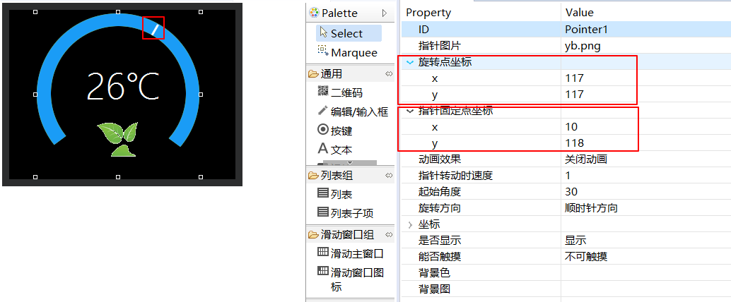 有两个属性共同决定指针旋转圆心坐标, 它们就是 旋转点坐标 和 指针固定点坐标- 旋转点坐标
